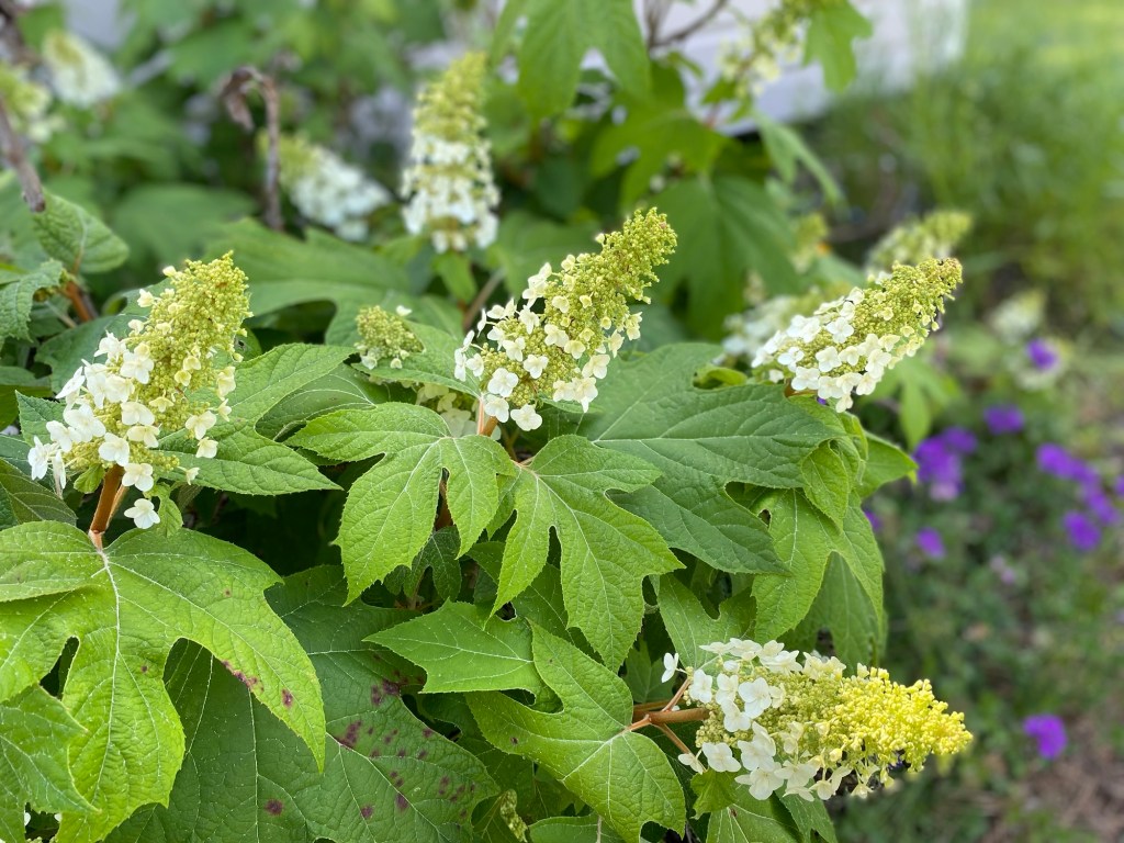 Oakleaf hydrangea (Hydrangea quercifolia), is a shrub that can grow between 3-8 feet tall. The blooms on this plant boasts elongated, cone shaped clusters and emerge green, turn to a downy white, and then transform to mauve as they age. The foliage resembles an oak leaf (hence the name), and changes to a stunning burgundy color in the fall. Flowers appear on old wood, so young plants need a season or two to reach their potential. Oakleaf hydrangea prefer well-drained soil with some moisture, and flourish in full sun to partial shade; they do especially well in morning sun with some afternoon shade. The best way to propagate these shrubs is with stem cuttings.